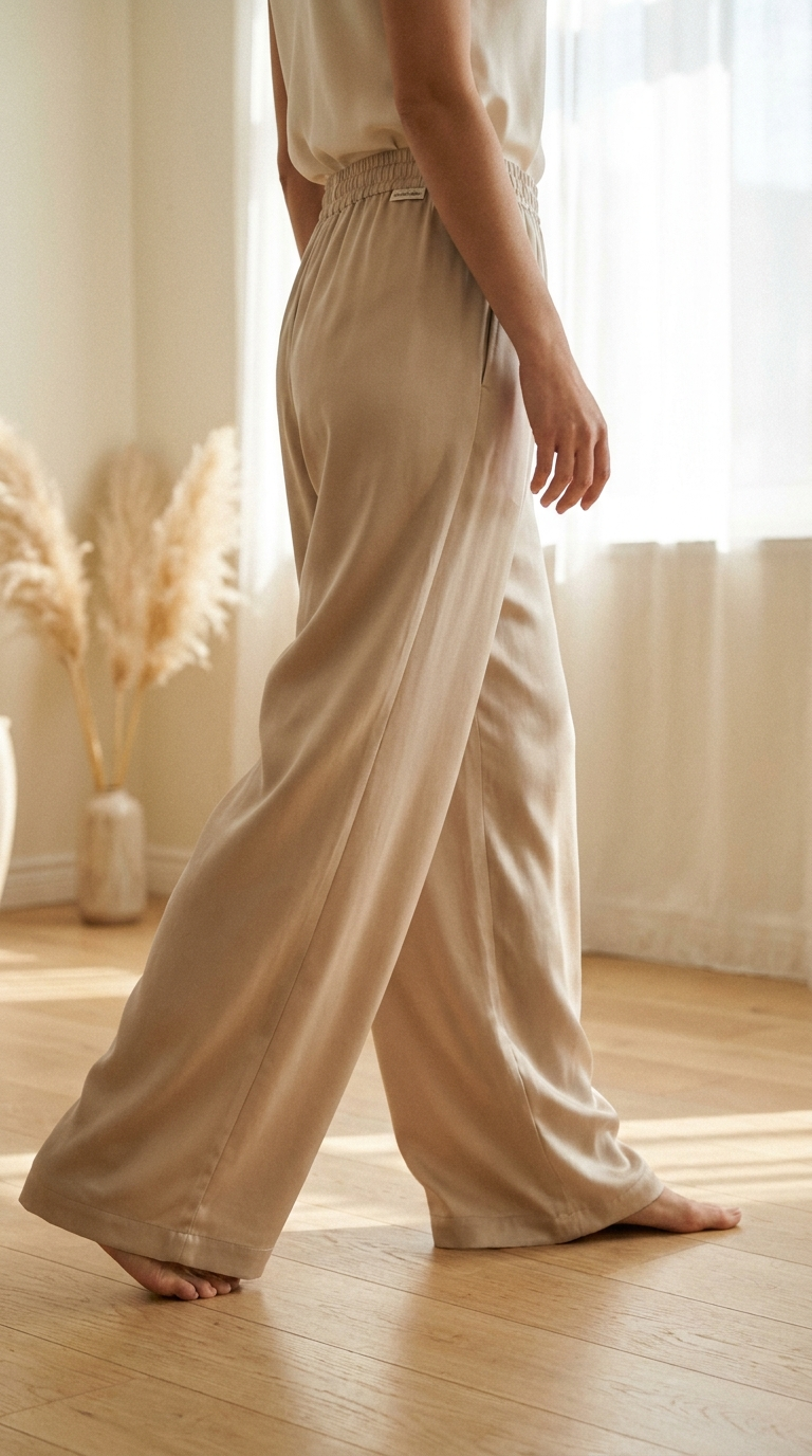 A nossa calça fluida é composta por 93% seda de amoreira natural e 7% elastano. Esta mistura preciosa garante um caimento sedoso, um brilho subtil e a elasticidade certa para acompanhar os seus movimentos.