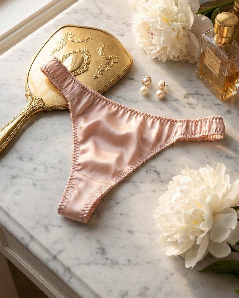 “Я взяла три кольори (Шампанське, Чорний, Ліловий). Шовк ідеально зберігається після кількох прань, дотик залишається м’яким і шовковистим. Я більше не повертаюся до бавовняних стрінгів.”
